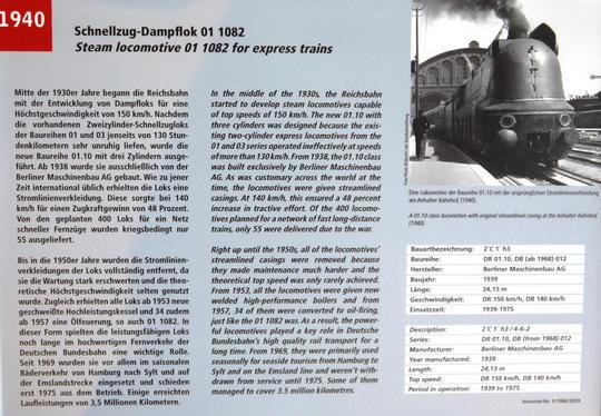 Information in the Deutsches Technikmuseum, Berlin on 21st September 2018. This records the loco's career as one of pre-war Germany's excellent streamlined Pacific locomotives. The streamlined casing was removed in the 1950's to ease maintenance, revealing a very handsome locomotive.
