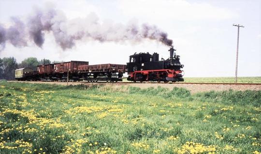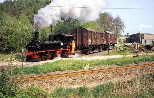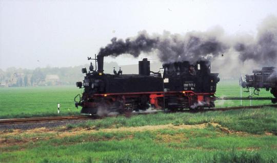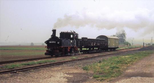 Working a short pick-up freight at at Schweta (between Oschatz and Mügeln) on 3 May 1993. Notice the bar coupling to the transporter wagon and the buffers of the standard gauge wagon it is carrying.