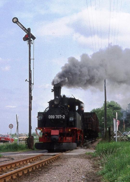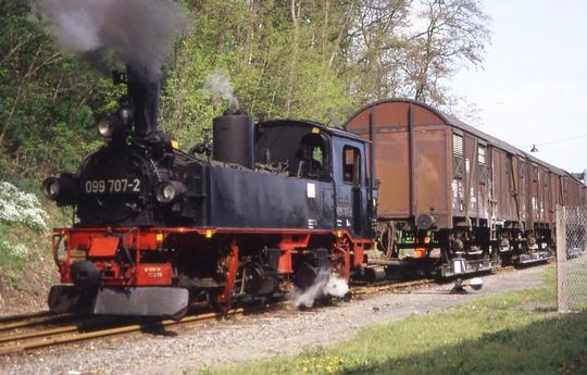 A light load for the loco at Naundorf on 3 May 1993. Notice the standard gauge wagon carried on the narrow gauge transporter wagon.
