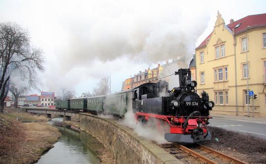 99 574 alongside and crossing the River Döllnitz in Oschatz town, en route Mügeln 30 March 2013