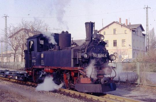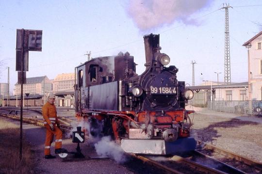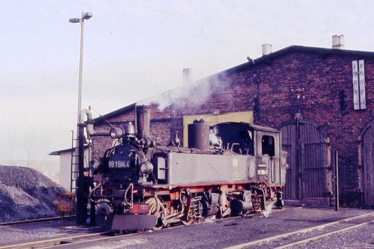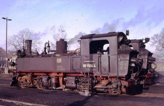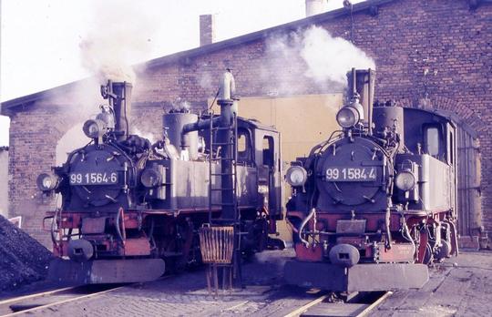 Outside Mügeln depot with sister loco 99 1564-6 which was taking water. January 1992.