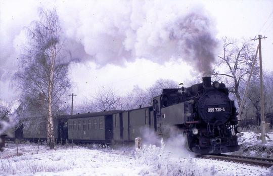 Deep winter action with 099 730-4 south of Zittau en route to Bertsdorf on 29 December 1992.