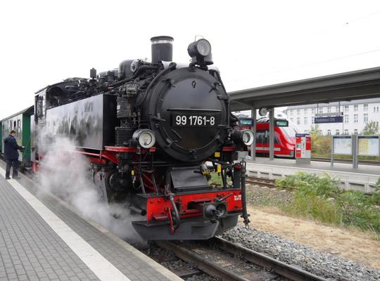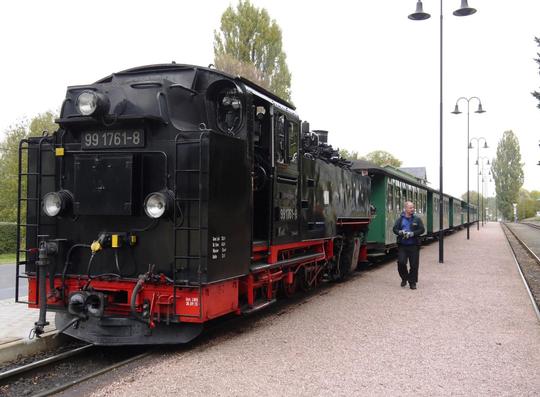 Standing at Radebeul Ost station, with a DB standard gauge unit in the background on October 1st 2018.
