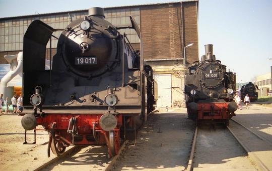 2-8-2 No.19 017 accompanied by 0-4-4-0T No.98 001 on display at the spectacular DB Chemnitz Works Open Day on 25 June 1994.