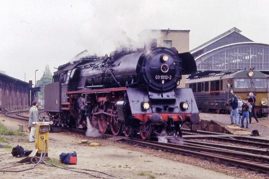 Pacific 03 1010-2 at Gorlitz station, which is a border station; notice the PKP diesel No. SU46-047 in the photograph which will take the stock forward to Poznan, whilst the loco will be serviced at the Gorlitz depot on 1 May 1994.