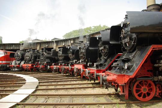 Pacific 03 1010-2 is nearest the camera in a display of locomotives around Halle P depot turntable on the occasion of a festival Open day, 4 July 2009.