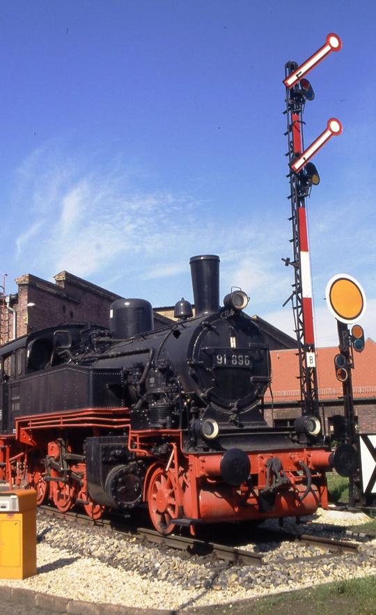 DR 2-6-0T No.91 896 plinthed outside Freidrichstadt depot, Dresden on 18 May 1996