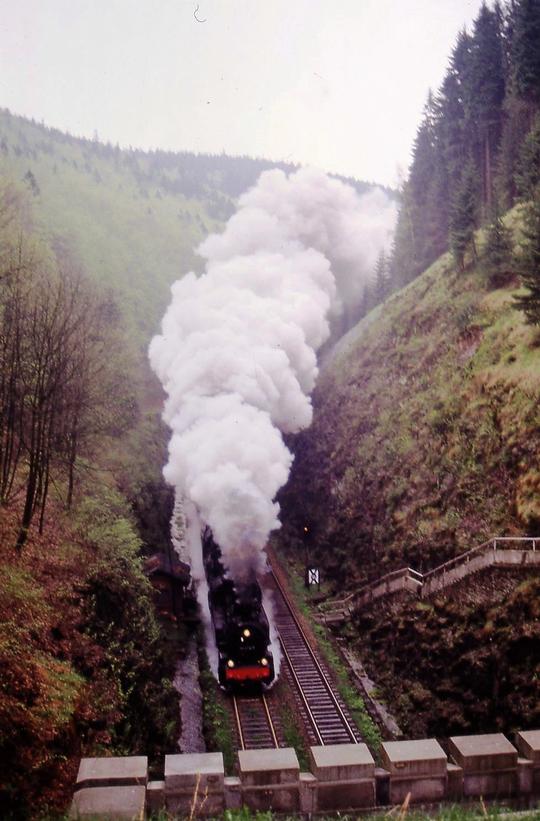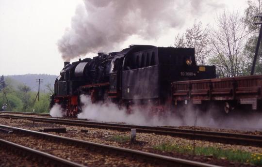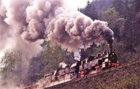 94 1292-5 piloting 2-10-0 No.50 3688-4 with a freight ascending Gräfenroda bank en route Oberhof on 5 May 1994.