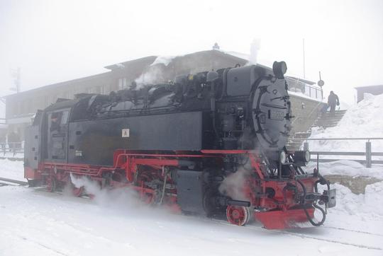 There's little point in having reached the Brocken summit if you're going for the views in this sort of weather. Running under it's old East German number as 99.236 the train prepares for its return to Drei Annen Hohne on 28th March 2013.