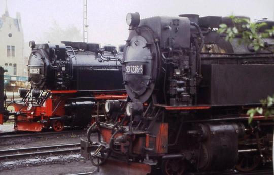HSB Nos. 2-10-2T's 99 7236-5 & 99 7235-7 in close-up outside Wernigerode depot, 30 April 1997