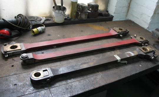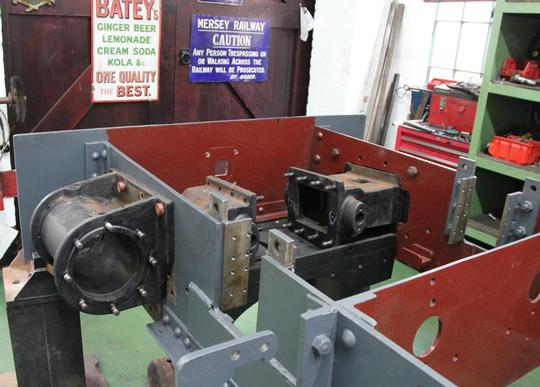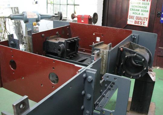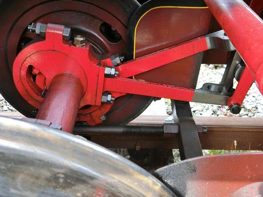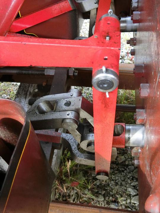 The Stephenson's link valve gear between the frames driving the valves to the right of the photo.