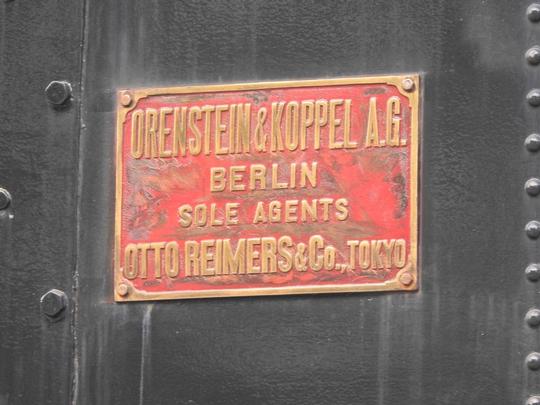 An interesting version of the Orenstein & Koppel builder's plate with the Japanese agent for the builders also shown. It gives a insight into how orders were won and locomotives supplied to overseas customers.