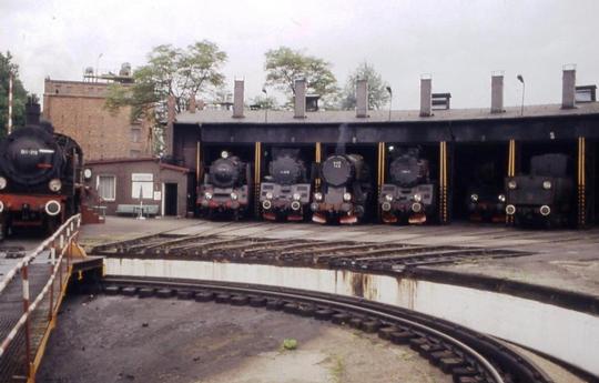 Ok1-359 (Extreme left) at the far end of the turntable, and semi-round house with five more incumbents at Wolsztyn, 24 August 1996