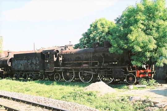 01-035 stored disguised as a tree with other locos outside Nis Station, Serbia on 8 May 2004