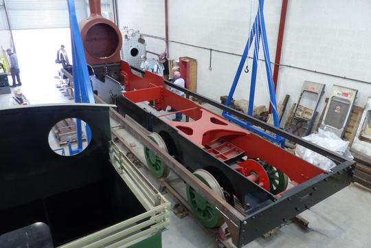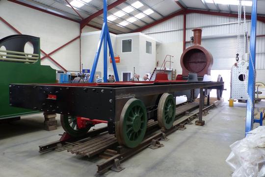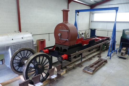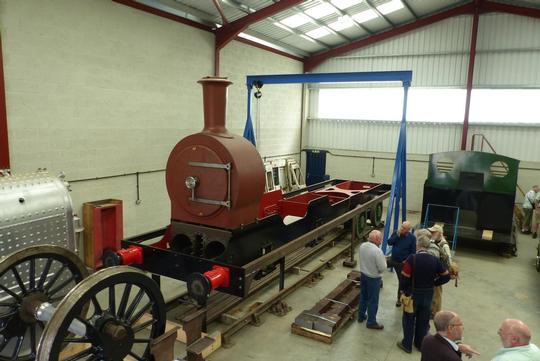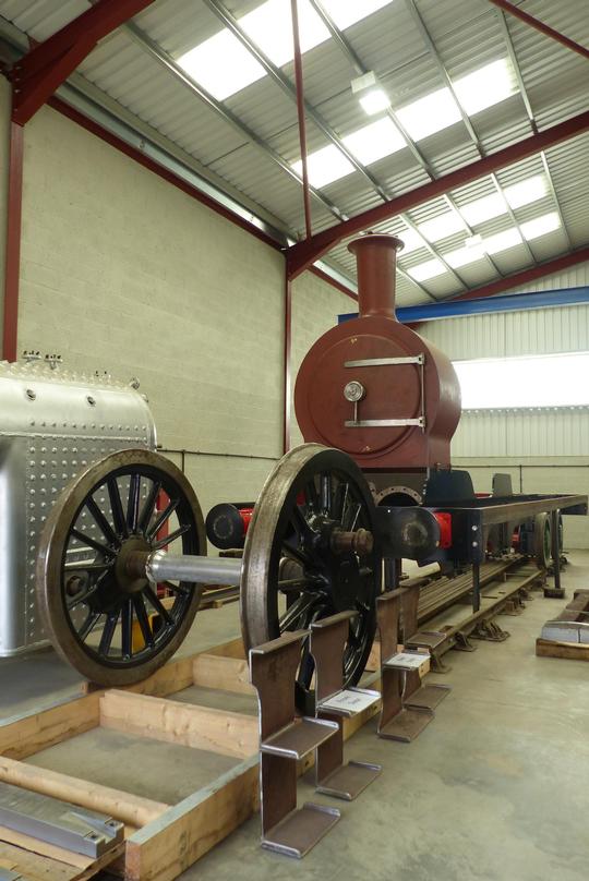 This photo is from 25th August 2018 and shows the point in the construction that has been reached. Well, it doesn't really do justice to the work they've been doing. The expensive crank axle is being made, the second set of driving wheels is on site, and the boiler and other parts are there. See the other photos.