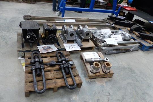 A visit in June 2020 revealed lots of components have been completed for the loco. In this shot, the four springs for the diving axles, the coupling rods, two mechanical lubricators, the pistons, piston rods, piston rod guides and crosshead bodies can be seen.