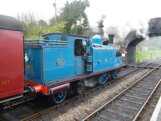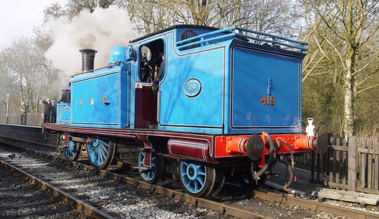 No.419 gets steam up at Sheringham station on the North Norfolk Railway during a visit in 2019. Notice the Caledonian Railway route indicator on the top lamp bracket.