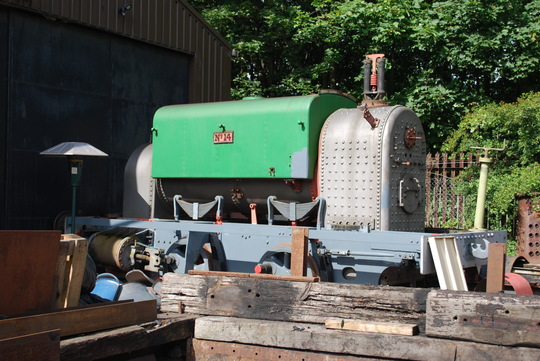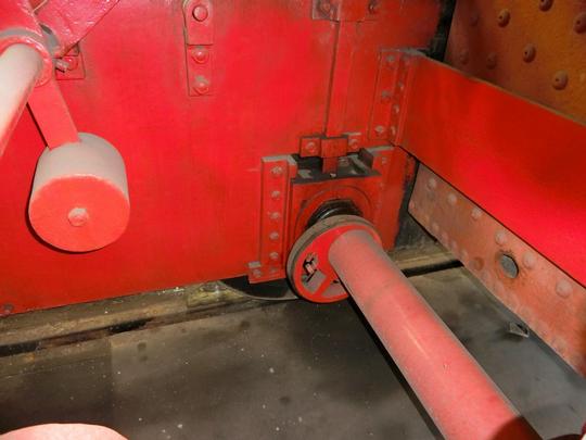 In the cab, the firebox lacks all fittings, but the reverser lever is still present. August 2019.