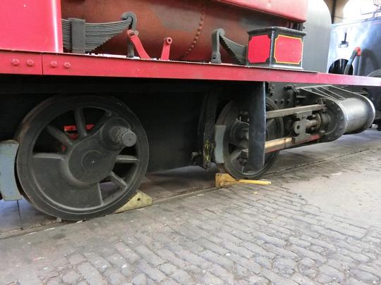 Between the frames the right hand eccentrics can de seen, lacking much of the rest of tis part of the valve gear, The counterweight gets into the picture on the left. August 2019.