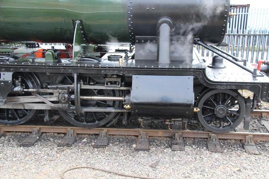 The classic Great Western front end from the Churchward era. His more modern designs laid the foundations of GWR, LMS and BR locomotive design. Here are the big outside cylinders with a big motion plate which also supports the boiler. At the very front are the supports for the front extension frame, bracing it to the smokebox as in contemporary American practice.