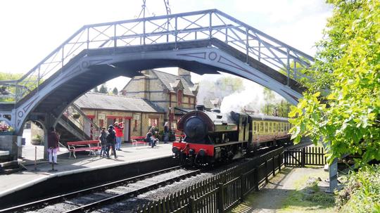 0-6-0ST 'Victor' seen through the arch of the former North Eastern Railway footbridge at Haverthwaite station on 4 May 2019