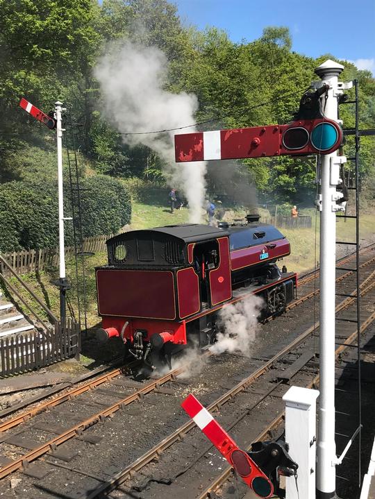 Framed by signals 0-6-0ST 'Victor' runs round it's train at Haverthwaite station on 4 May 2019