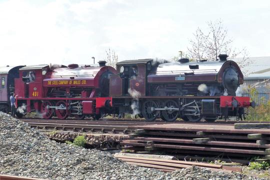 The two surviving Bagnall tank locos built for the Steel Company of Wales at the North Tyneside Railway on 30th April 2022. Leading loco is 'Victor' (2996/1951) visiting from the Lakeside & Haverthwaite Railway with 401 (2994/1950) behind. 'Victor' wears the paint scheme of its days with the British Motor Corporation as would have 401 when It carried the name 'Vulcan'. Both names honoured the Royal Air Force's 'V' bomber fleet - the Handley Page Victor and the Avro Vulcan.