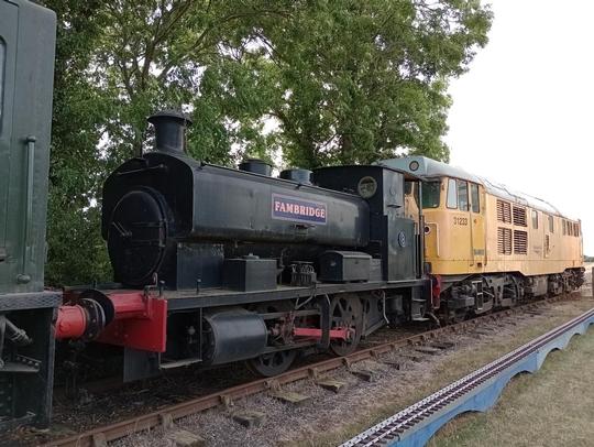 'Fambridge' photographed in the summer of 2022 stored between a diesel shunter and a Class 31 diesel-electric loco.