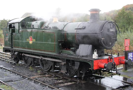 The distinctive look of the GWR 5600 class is seen in the pouring rain at the Embsay and Bolton Abbey Railway in October 2018.