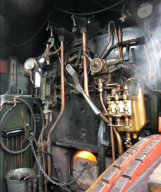 The cab is the driest place to be in the October rain at the Embsay and Bolton Abbey Railway. Typical GWR cab layout. Right hand drive, lever reverse, sight feed lubricator and single water gauge.