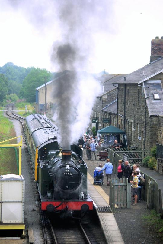 leaving the throng behind, GWR 0-6-2T No.5643 barks away from Leyburn with a train for Redmire on the Wensleydale Railway on 31 July 2011.
