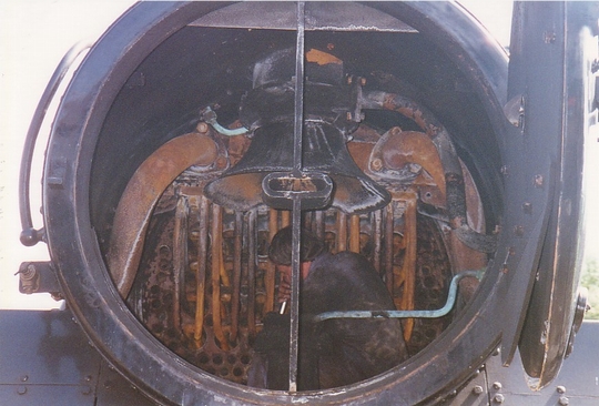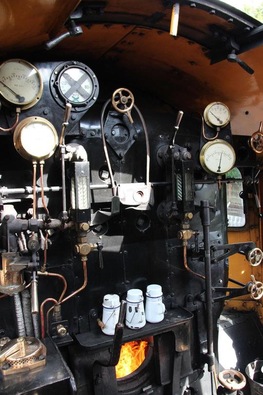 In the cab of this British Railways standard class 5 loco. The loco is left hand drive so most of the driver's controls are out of shot. Notice the cans of tea keeping warm above the firebox door and the token giving authority to enter the section of line hanging on a valve.