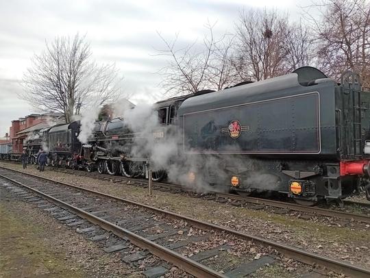 BR Standard 5MT 4-6-0 No. 73082 'Camelot' coupled behind sister loco 73156 during the Great Central Railway's Winter Steam Gala from its home on the Bluebell Railway, 28th January 2023.