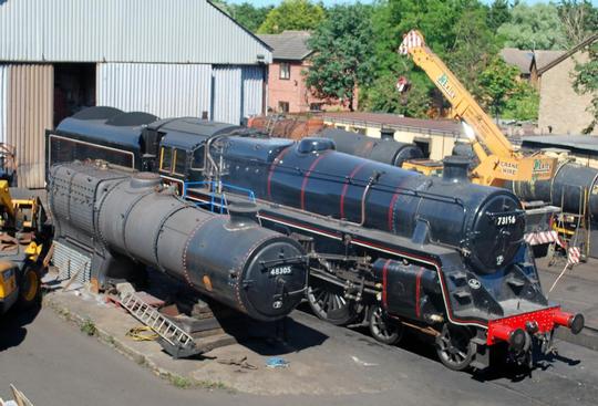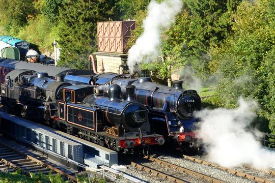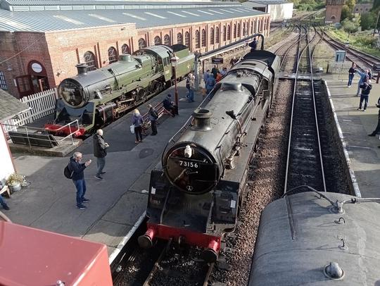 Two BR Standard 4-6-0s at the Bluebell Railway's Giants of Steam Gala on 15th of October 2022. On the left is resident Standard Class 4 75027 and, on the right, visiting from the Great Central Railway is Standard Class 5 73156.