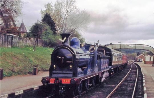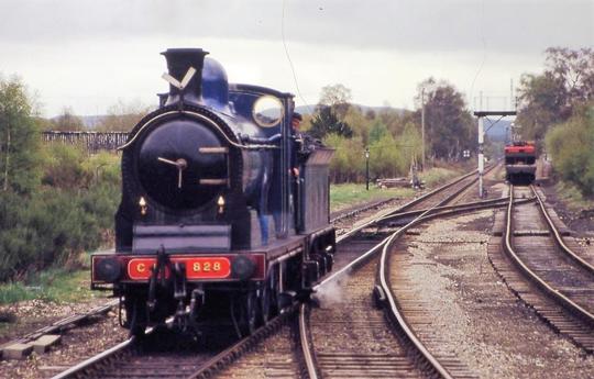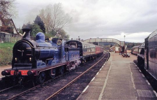 In Caledonian Railway blue livery as 828 in Boat of Garten Station on the Strathspey Railway, 7 May 1995.