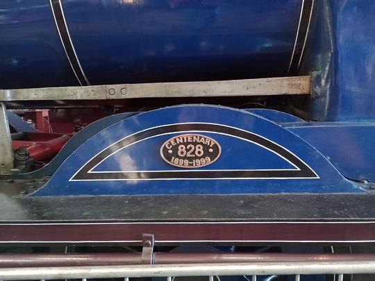 On a visit to the Spa Valley Railway, No. 828 shows this brass plate marking the loco's centenary in 1999.