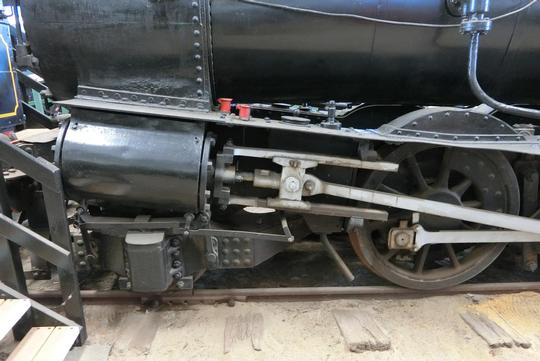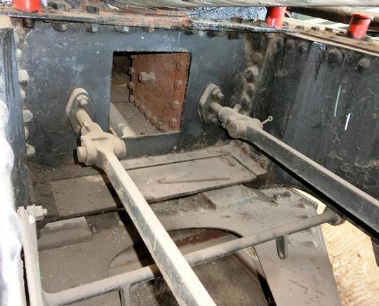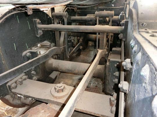 Between the frames, looking towards the driving axle showing the Stephenson link valve gear.
