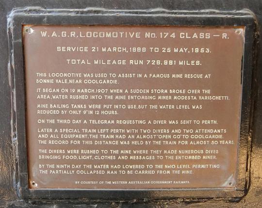 Plate on the loco recording it's role in a mine rescue in 1907.
