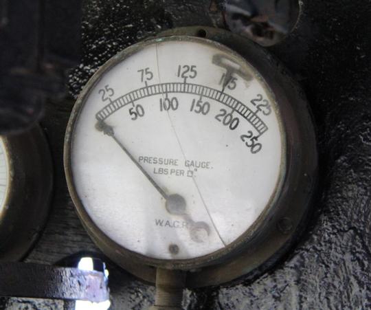 The boiler pressure gauge set to 175 psi, May 2018