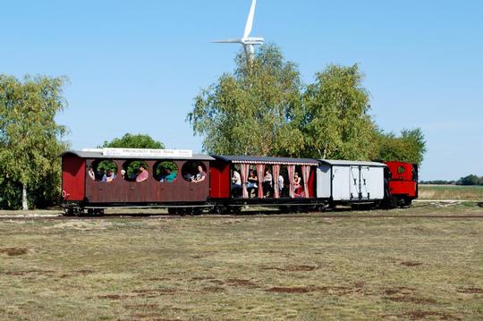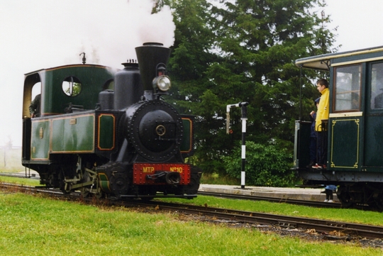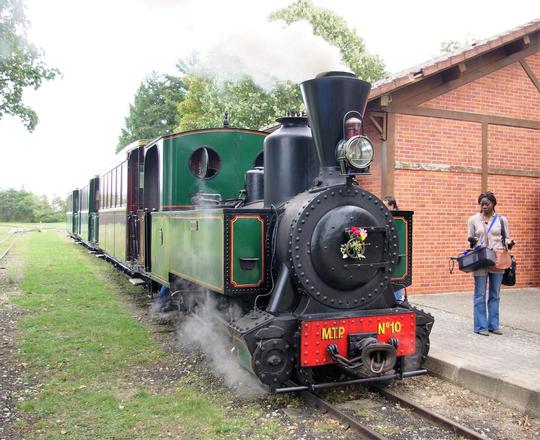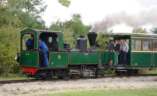 MTP 0-6-2T No.10 'La Martroy' hauling its train at Bellbat, Pithiviers, France 17 September 2011. The open vestibule remains as popular as ever.