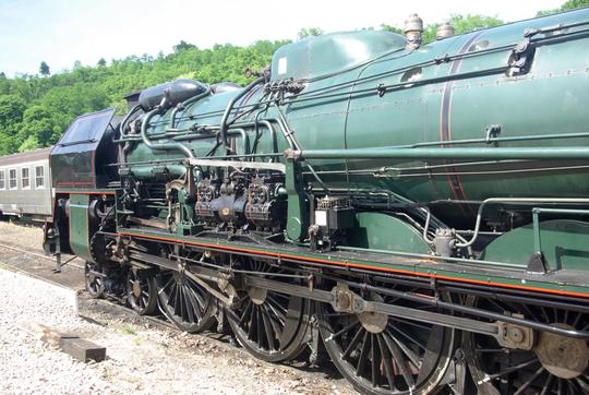 241P17 running around its train at Chagny whilst bound for Belfort on 14th June 2015. This view of the right hand side of the loco shows that it has an injector below the cab as well as the feedwater heater at the front end. The generator for the electric lighting sits on the running plate.