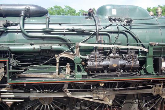 More detail of the left hand side of the loco. The feedwater pump dominates the centre of the photo with the feedwater heater top left. Notice the sandbox around the dome as in American practice. Interestingly, the drive for the mechanical lubricator is taken from the expansion link.