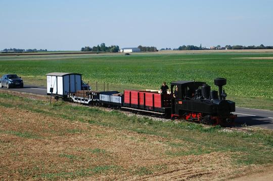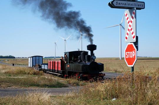 The roadside tramway nature of this former sugar beet hauling line is clear in this September 2019 photo as the short train runs across the level land of the Paris basin.