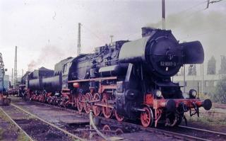 Ex DR rebuilt Kriegslok 2-10-0 no 52.8087(unrebuilt no. 52.2455) at Tubingen during the Steam Festival there at Easter 1998