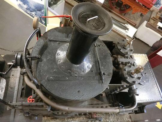 This unusual view, looking down on the loco shows the layout of the machine well. Ahead of the boiler on the right of the photo are the two vertically mounted cylinders with the main steam pipe from the regulator valve (on the left of the photo) at the bottom.