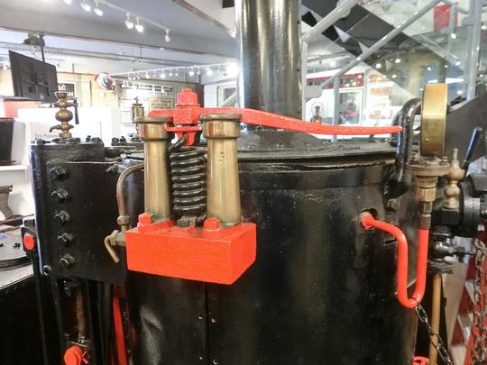 The boiler of this typical De Winton product with the regulator, centre, and the reverser to the right. The boiler pressure gauge is to the left hand side.