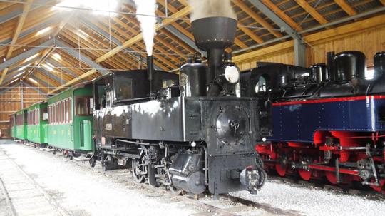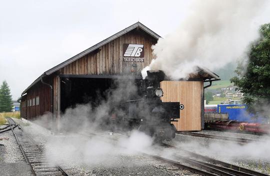 Wreathed in steam 0-6-0T No.Z6 'THÖRL' emerges from the shed at Mauterndorf on a damp 28 July 2019.