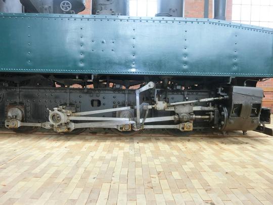 Detail of the right hand cylinder and valve gear on this Great War era eight coupled tank loco. These worked the light railways supplying the front line during the conflict and were much used in a wide variety of industrial, agricultural and extractive operations thereafter.