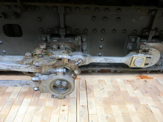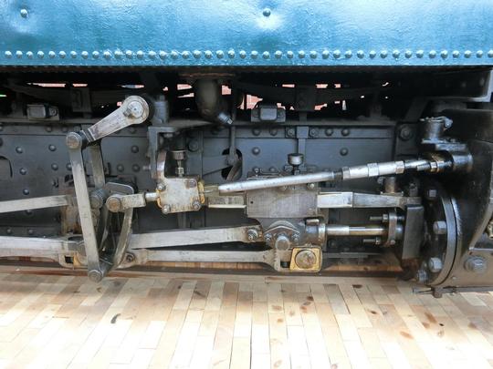 Detail of the right hand outside valve gear for this eight coupled tank loco. Note that the expansion link is at the top of its travel indicating that the loco is in full reverse gear. Check to position of the reverser in the cab photo!