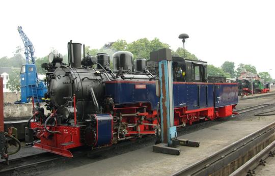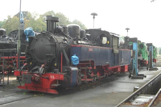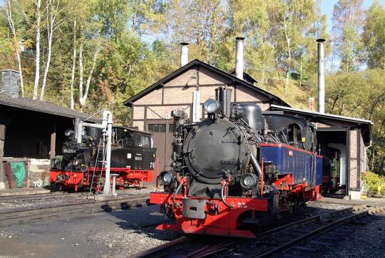'Aquarius C' (Army; SL 22; Zillertalbahn 4) whilst working on the Preßnitzbahn, with 0-6-0T No. 99 4511-4 outside Jöhstadt depot, 4 October 2011